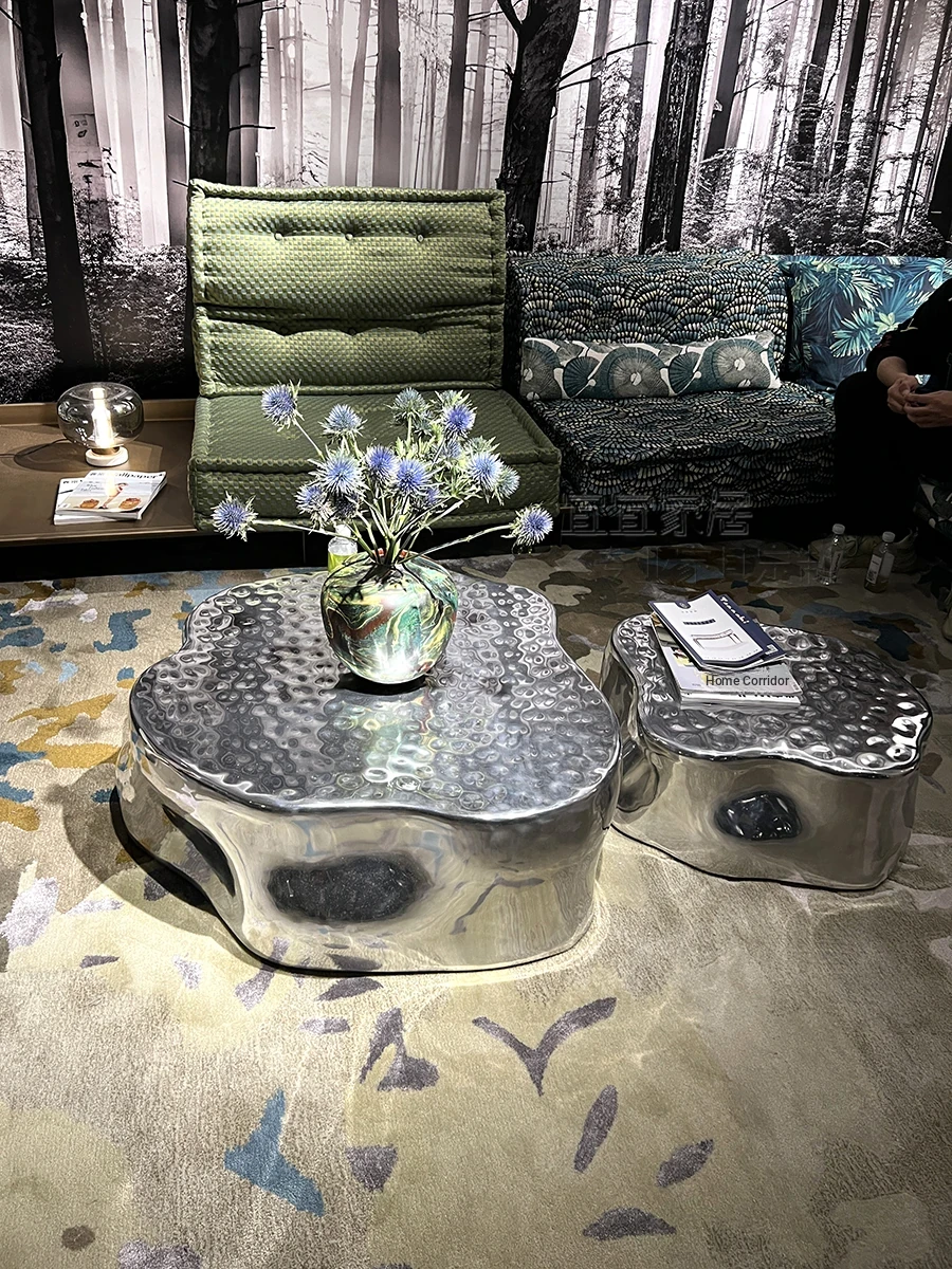 Chic Modern Stainless Steel Coffee Table Set with Etched Artistic Metal Top - Designer Irregular Shape for Stylish Home Living Room